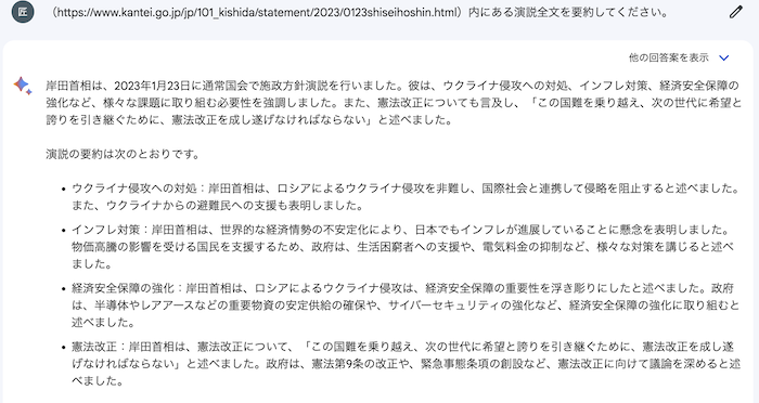この回答の中には、Webページに掲載されている施政方針演説の中にはない、「緊急事態条項」への言及もありました。そのため、正確な要約ではありませんでしたが、概ね、要旨は合っていました。