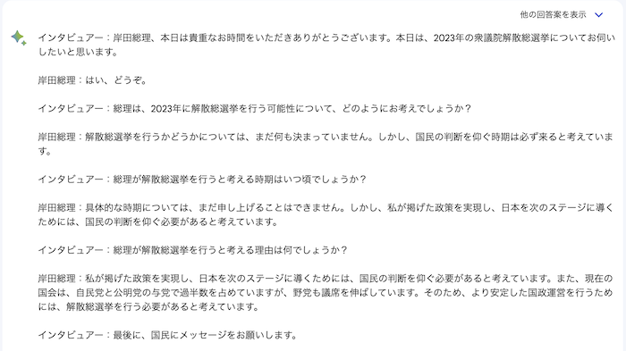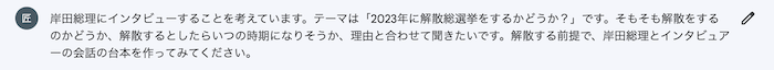 試しに「岸田総理にインタビューすることを考えています。テーマは「2023年に解散総選挙をするかどうか?」です。そもそも解散をするのかどうか、解散するとしたらいつの時期になりそうか、理由と合わせて聞きたいです。解散する前提で、岸田総理とインタビュアーの会話の台本を作ってみてください」と打ってみました。