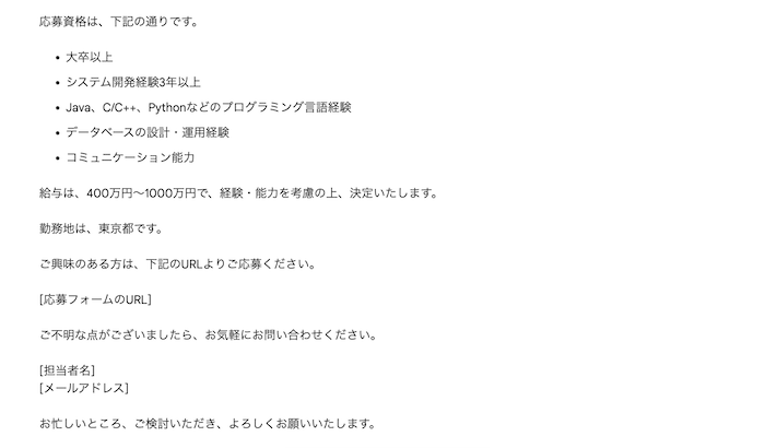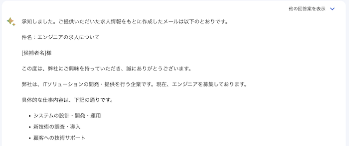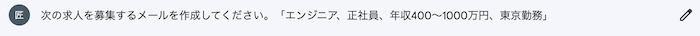 試しに「次の求人を募集するメールを作成してください。『エンジニア、正社員、年収400〜1000万円、東京勤務』」と打ってみました。