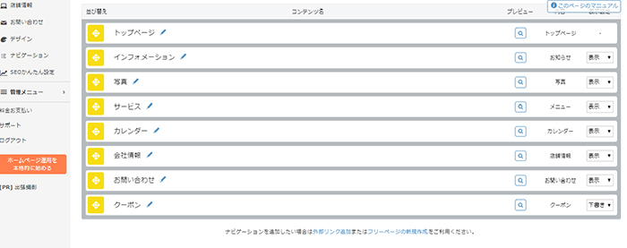 グーペでは、既に構築されたナビゲーションがあるため、その項目名を変更したり、不要なものは非表示にしたりして、オリジナルのナビゲーションを完成させることができます。