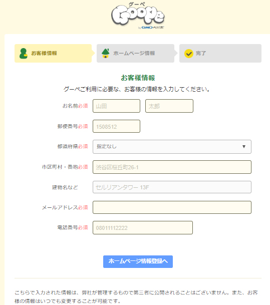 申し込みを完了したら、初期設定をします。初期設定画面では、個人情報とホームページ情報をそれぞれ入力。「お客様情報」には、名前、住所、メールアドレス、電話番号が必須です。