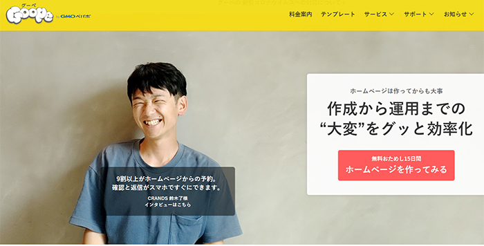 Webサイトを制作する専門業者に依頼した場合、費用はそれなりに必要です。しかし、グーペの場合は初期費用1000円~でOK。レンタルサーバーやドメインの運用費用も不要なため、お財布にも優しいサービスですね。