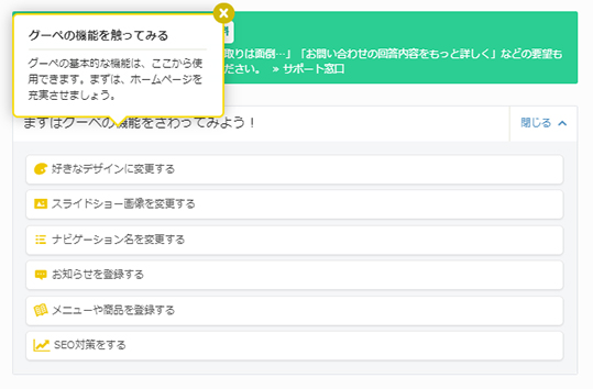 最初の画面では、基本的な「グーペ」の機能について必要な作業を提案してくれます。基本は、「好きなデザインに変更する」「スライドショー画像を変更する」「ナビゲーション名を変更する」「お知らせを登録する」「メニューや商品を登録する」「SEO対策をする」の6項目。それぞれどのようなことができるのか、大まかなポイントを紹介します。