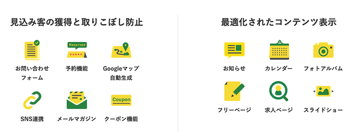 テンプレートのデザイン性の高さ、予約機能やカレンダー機能、クーポンやメルマガといった基本機能に加えて、ショッピングカートやブログ機能も姉妹サービスと紐づけすることができます。中にはインバウンド向けの多言語翻訳機能まで搭載。困った時は電話サポートに頼ることができるので、安心してこれらを使いこなすことができます。