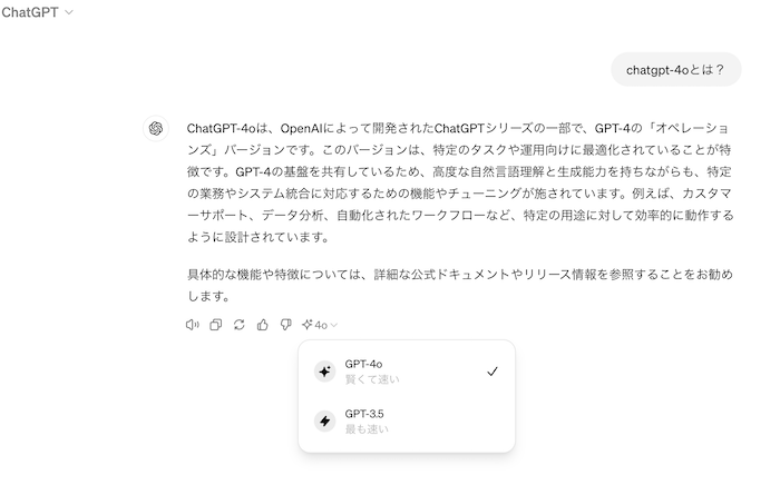 無料モデルの場合は、使ってみると、既に「GPT-4o」のモデルが選択されています。これを5時間で10回連続で使うと、GPT-3.5のモデルのみ利用できるようになります。