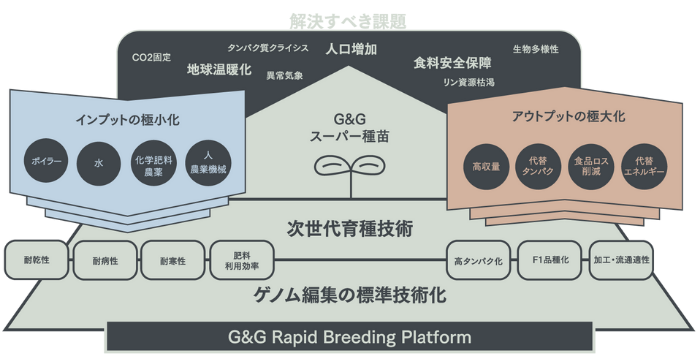 その問題点に対してグランドグリーンは、ゲノム編集技術で既存の作物品種の問題点にピンポイントでアプローチし、短期間での品種改良を目指しています。
