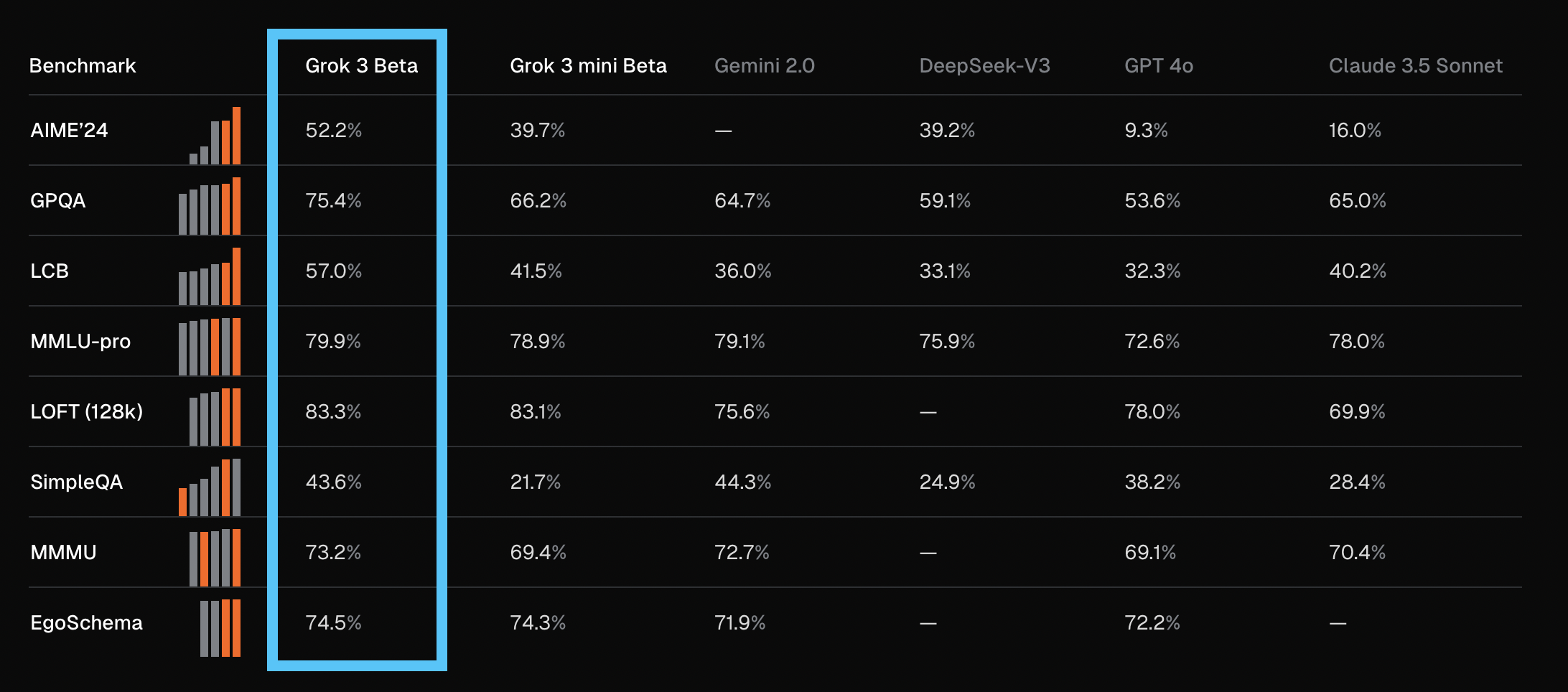 Grok 3は、特に数学(MATH)と科学(GPQA:84.6%)でGPT-4oを上回る一方、プログラミング(HumanEval)や一般能力(MMLU)ではGPT-4oとほぼ互角またはわずかに劣っているのが現状です。
