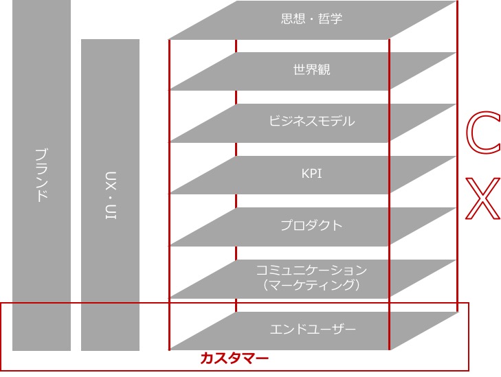 一般的にマーケティングといえば、ユーザーとの接触ポイントでのコミュニケーションを指すことが多いです。言葉の定義によって話が変わってしまうので、私の場合は相手に応じて意図的に使い分けることもあります。また、僕の頭の中を整理したマーケティングレイヤーのフレームを用いてお話したりもします。
