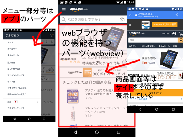 中央の画面がアマゾンの「アプリ」、そして右側の画面がアマゾンの「サイト」です。