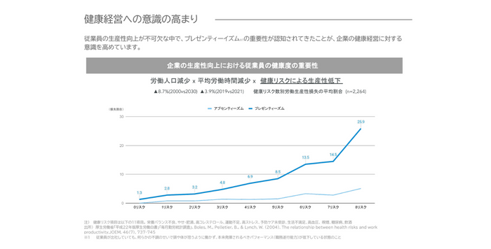 つまり、企業は健康に対して注目し、働く人の健康を支援していかなければいけません。そうしなければ、持続的な企業の成長に影響が及ぶと考えています。