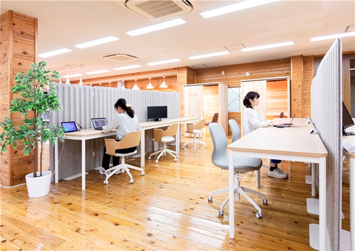 オフィスエリアは自立式スクリーンで緩やかに空間を分ける構造となっています。電源、Wi-Fiを完備し、サブモニター、オンライン会議用の個室ブースなどを設置して機能性を意識しました。