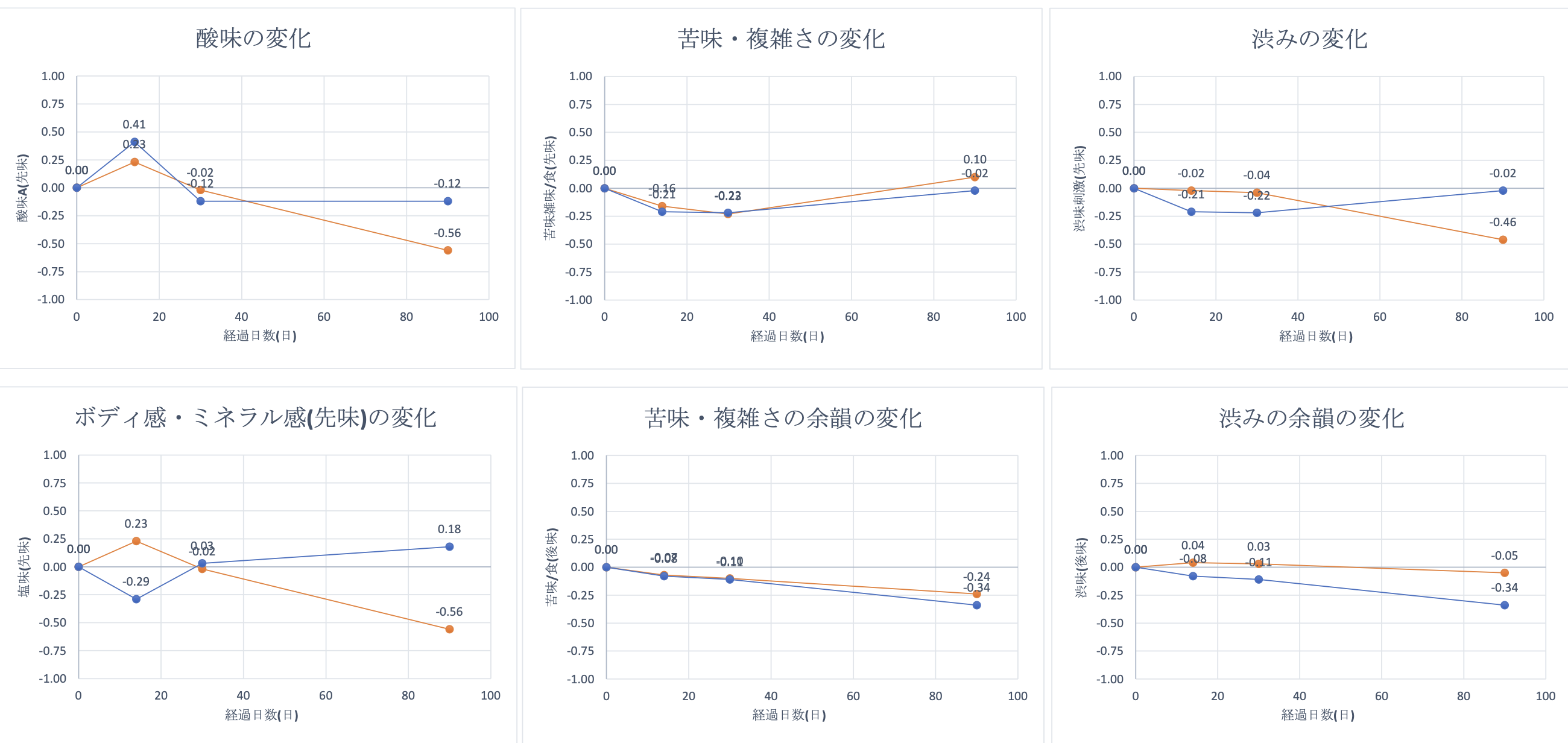 【白ワインの実験結果】 開封後の白ワインを当社の真空容器で保存。数値が1を超えると味の変化を感じる。1ヶ月時点で味に変化はなかった。(青は冷蔵保存、赤は常温保存)、株式会社味香り戦略研究所調べ