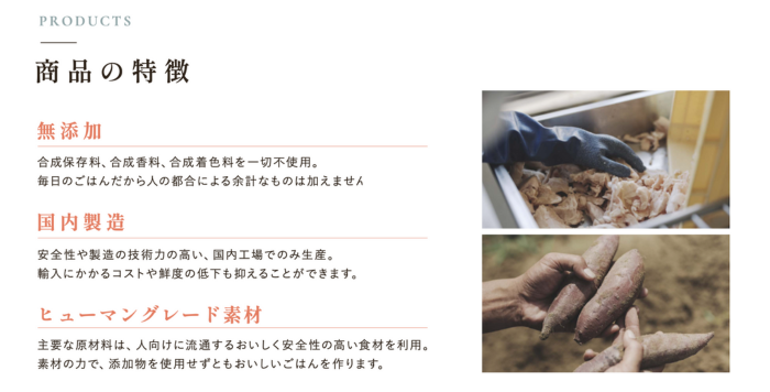 佐藤:当社が掲げる3つの軸のうち「国産」を満たしている他社はあるものの、多くの企業は「無添加」「ヒューマングレード素材」を満たしていません。