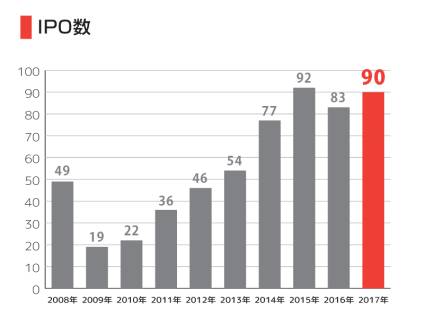 そして、2017年に再び増加を見せ、IPOした企業は90社にのぼりました。