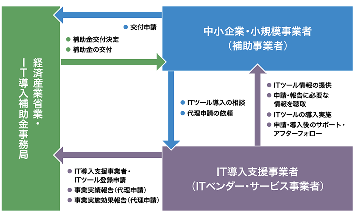 「IT導入支援事業者」とは、中小企業・小規模事業者などの生産性向上のために、ITツール(ソフトウエア・サービス等)の提案・導入及びこれに要する各種申請等の手続きを代理で行う方たちのことです。
