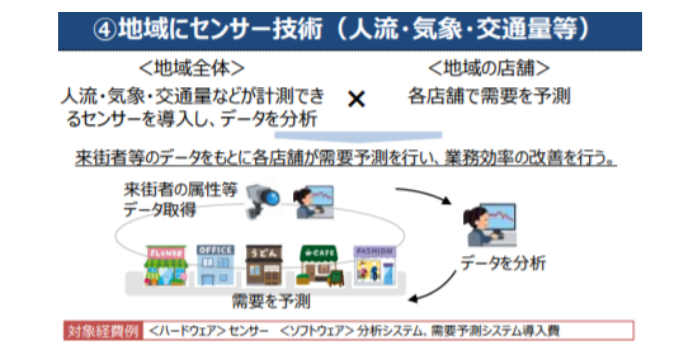 複数社連携IT導入類型を活用するイメージとしては、以下のような事例を想定されています。どの事例においても消費の動向を分析するシステム等を商業集積地に導入し、データを収集・分析することで、当該地域の来街者増や回遊性向上等を図り、生産性向上につなげることを目的としています。