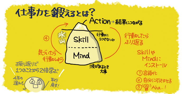 例えば、今日のこのセミナーに参加するのも「アクション」です。しかし、参加しただけでは何もならなりません。アクションをして得たものをスキルやマインドに落とし込み強化するために「ふり返り」が必要なのです。