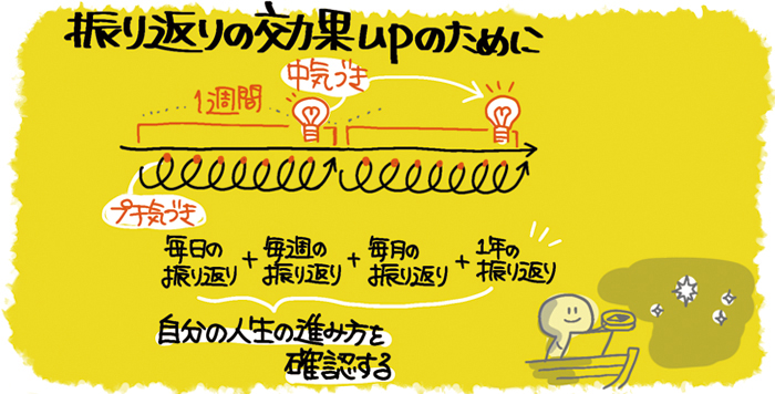 伊藤:タイミングを決めて定期的に見返すことです。例えば、毎日の1行日記を「プチ気づき」、1週間ごとの「中気づき」、2カ月や半年といった期間での「大気づき」というように、視点を変えて気づきを導き出します。年の初めには前の1年をふり返り、次の1年の計を立てます。