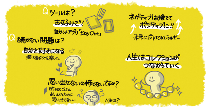 伊藤:人それぞれ好みでいいと思います。紙がいい人は手帳などがいいでしょうし、私の場合は色々なところで手軽に入力でき、写真も入れやすい「Day One」というライフログのアプリを使ってます。