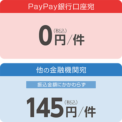 PayPay銀行の振込手数料は、同行宛の場合、0円/件。他の金融機関宛の場合145円/件(税込)です。一方、都市銀行では、同行宛が3万円未満で約100円、3万円以上で約300円。他行宛が3万円未満で約500円、3万円以上で約700円です。PayPay銀行は、インターネット事業銀行ならではのお得な手数料で振り込むことができます。