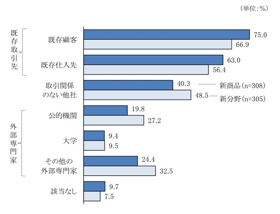 一方、新事業立ち上げを目指す中小企業の情報収集先のほとんどが既存顧客や既存の仕入先となっています。ここには、新しい相手から情報収集をする手段が限られているという事情が背景にあると考えられます。