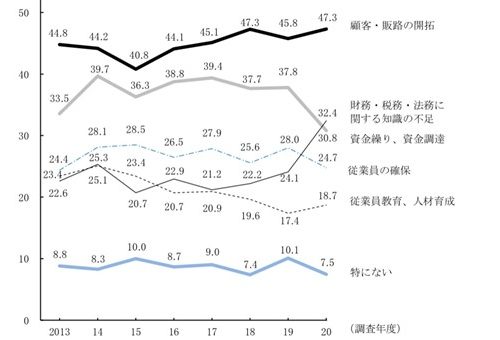 開業2年程度までの企業に対して「現在苦労していること」に関するアンケートを取ったところ、「顧客・販路の開拓」ついて半数近くが苦労している状況がわかります。