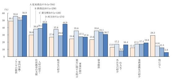 日本政策金融公庫のいくつかの調査によると、既存の販路や顧客開拓、売上の拡大に課題意識を抱えている中で、新事業の立ち上げに活路を見出そうとしている中小企業が多く存在。また、これらの企業は新事業立ち上げに関する様々な支援を必要としています。
