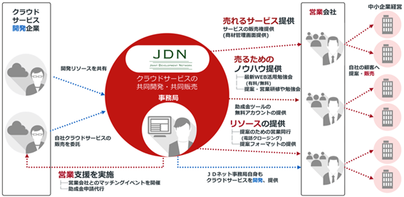 JDネットが仲介役となって、収益性の高い有用なサービスの開発や、開発したツールの営業支援、営業会社に対するサービスの販売権や販売ノウハウやリソースの提供などをおこないます。なおJDネット自体もクラウドサービスの開発し、商材の拡充を図っています。