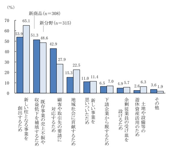 その背景を見ると「新しい収益の柱を作りたい」「既存事業の収益低下や売上低下の補填」という理由を挙げる事業者が多くなっています。