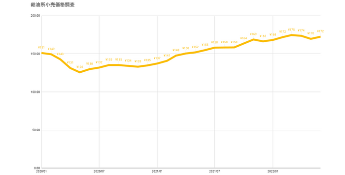 また、2020年からのレギュラーガソリンの小売価格の推移を見ていくと、2020年は150円以下で推移していたのが2021年になると徐々に高騰し、2021年10月あたりからは160円台となり、2022年からは170円台ともなる高値が続いているという状態がわかります。