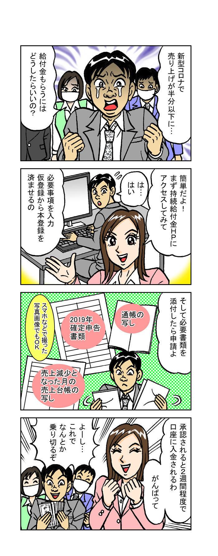 今回の持続化給付金は、厳しい審査というよりもスムーズに手続きを行い、窮地に立たされている中小企業や個人事業主を救済するという趣旨のものです。