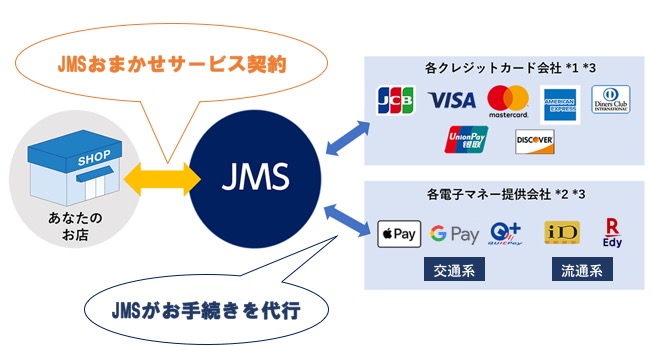 「JMSおまかせサービス」は、JMSとの契約で主要なクレジットカード、電子マネー、Apple PayやGoogle Payが利用できる便利なサービスです。