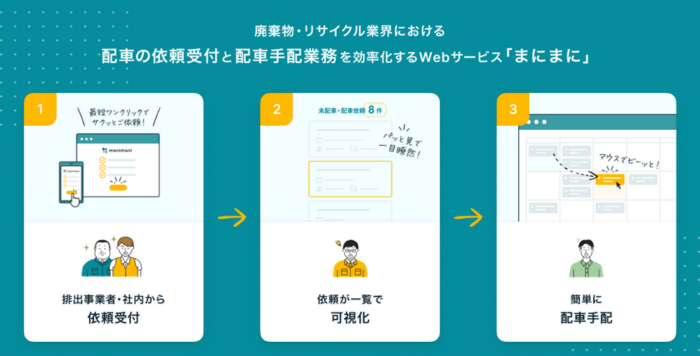 田平:JOMYAKUでは廃棄物・リサイクル業界、いわゆる静脈産業における配⾞の依頼受付と、配⾞⼿配業務を効率化するWebツール「まにまに」を提供しています。