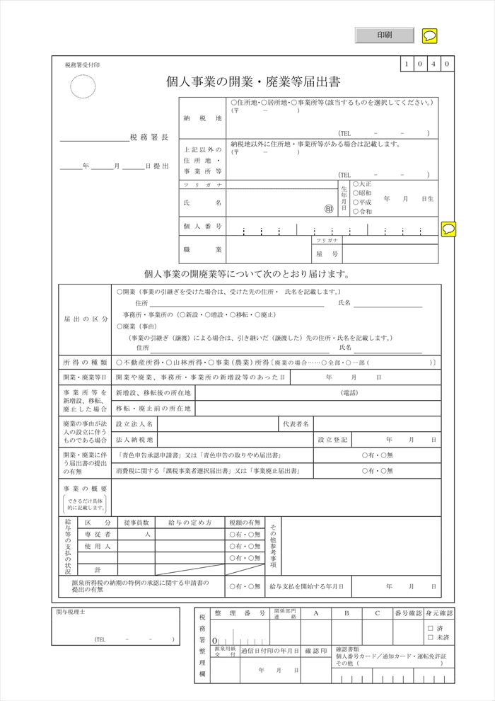 税務署に提出する開業届は、「個人事業の開業・廃業届出書」であり、多くの場面で「開業届」といわれる際はこちらの書類を指します。