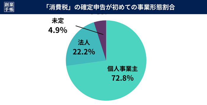 消費税の確定申告について「初めて」と回答した事業形態の内訳については、個人事業主の方が約73%で法人の方が約23%となっています。