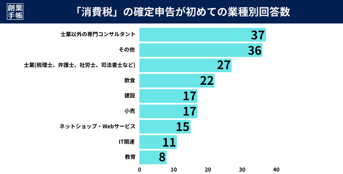 また初めて消費税の確定申告を実施すると回答した方の業種(※)割合を分析してみたところ、「士業以外の専門コンサルタント(経営コンサルタントやマーケティング会社など)」が37名、「その他」が36名、続いて「士業(税理士・弁護士・社労士・司法書士など)」が27名で、飲食や建設業の人が20名前後という結果になりました。その他については、ペットサロン経営者や運送業を営んでいる事業者の方などが見受けられました。