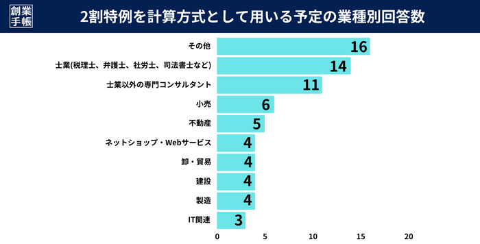 「2割特例」を選択した85名の業種割合についてみていくと、「その他」が16名と一番多く、続いて「士業(税理士・弁護士・社労士・司法書士など)」、「士業以外の専門コンサルタント(経営コンサルタントやマーケティング会社など)」が並び、その後に「小売」や「不動産」などの事業者が多いことがわかりました。