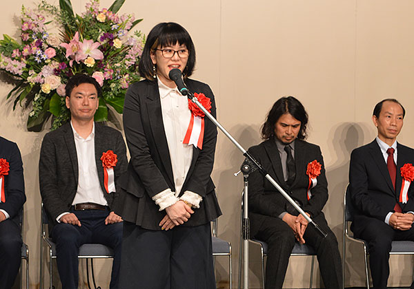 受賞後のスピーチを行う、トリプル・ダブリュー・ジャパン 山本氏