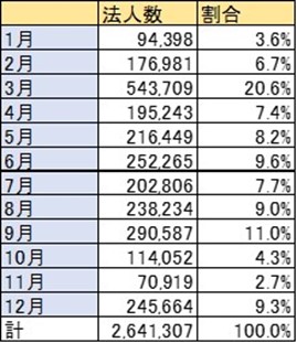 実際に日本企業がいつを決算月にしているのか調べました。国税庁がホームページで公表している決算月別の法人数は以下のとおりです。
