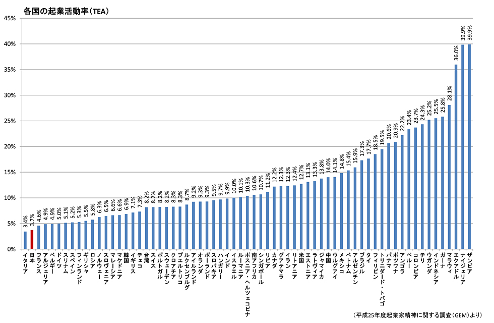 桑本:確かにそうですね。GEM(※1)による調査によると、TEA(※2)が、日本は5.4で、統計をとった全50ヵ国47位と、世界でも最低水準となっています。