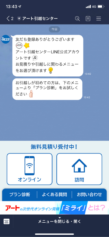 LINEを使って引っ越しの見積りの相談ができます。おすすめプランの診断や割引も適用されるというメリットがあります。