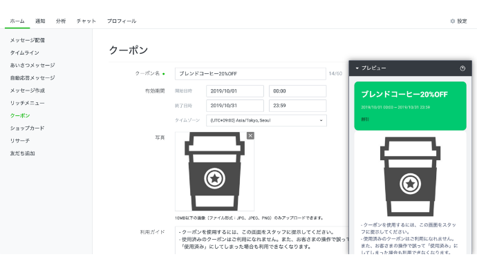 LINE公式アカウントなら、クーポンの発行も簡単です。クーポン名、有効期間、写真、利用ガイドを設定するだけで、お店のクーポンを発行することができます。