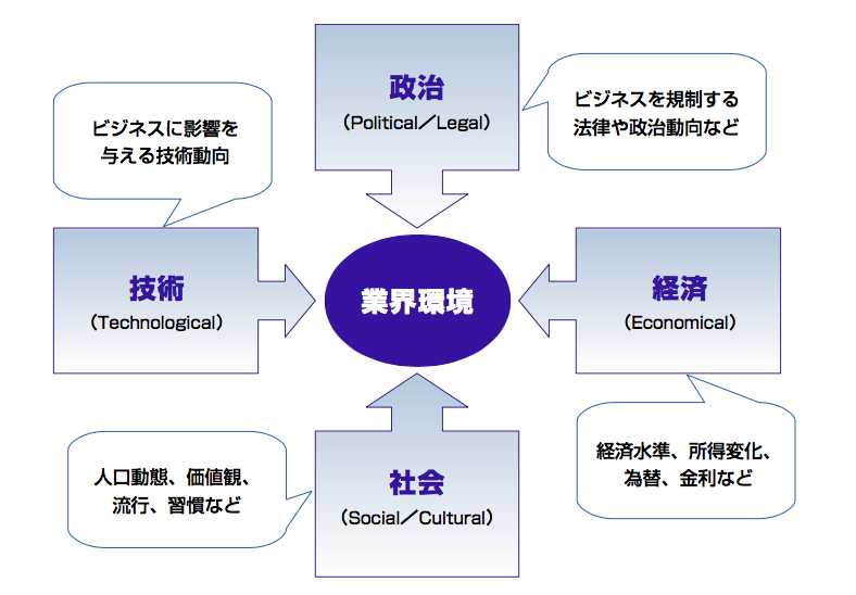 の頭文字を取ったもので、外部環境の中でもマクロ環境(企業にとって統制不可能で、無関係に起こっていること)を分析するためのものです。
