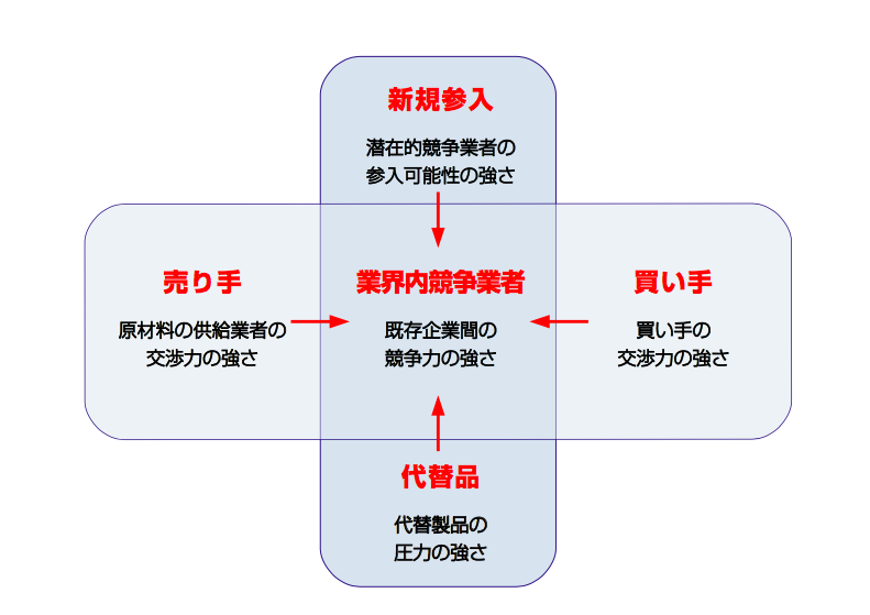 ポーターの5フォース分析は、業界がどのようなプレイヤーの力(フォース)に影響されているのかを理解するためのものです。