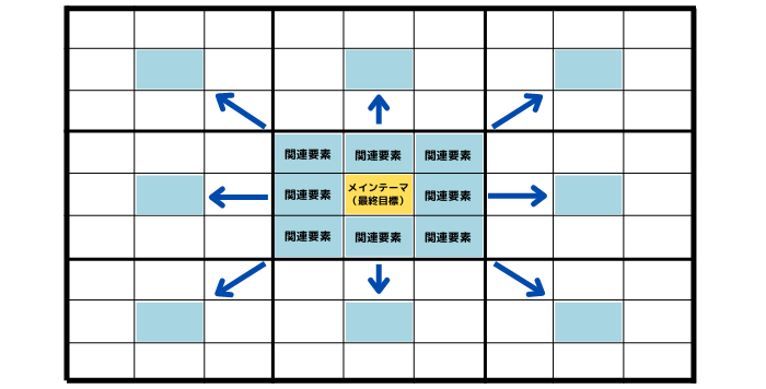それと同様に、マンダラートでは中央のマス目を中心に周りを囲むようにアイデアを展開していきます。