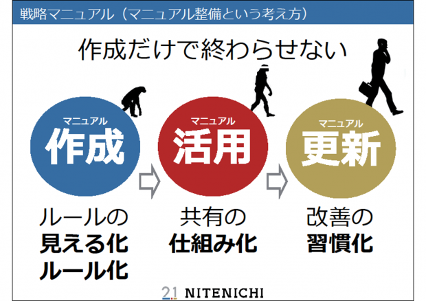 人を育てる、動かす仕組み、勝てる法則を浸透させるのがマニュアルです。