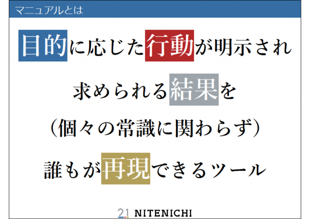 マニュアルの定義とは、「目的に応じた行動が明示され」「求められる結果を、誰もが再現できる」ルール、ツールと言えるでしょう。