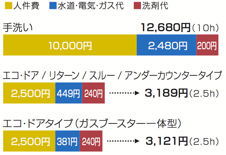 ■内訳(東京)●水道代:413円/m³(上水道代:213円/m³・下水道代:200円/m³)●電気代:3φ200V=16円/kWh・1φ100V=26円・kWh●ガス代:8.5円/kW●洗剤代:洗浄機用=570円/kg●人件費:1,000円/h