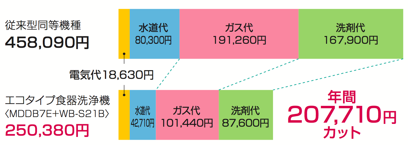 マルゼンの「エコタイプ」食器洗浄機では、水道・ガス・洗剤代が従来機器と比べて大幅削減できます!
