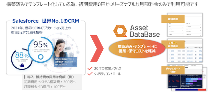 顧客管理CRMシステム「Asset DataBase」は初期費用・構築費用0円で、世界No.1CRMのSalesforceを利用できます。テンプレートは構築済みなので、活用も簡単です。